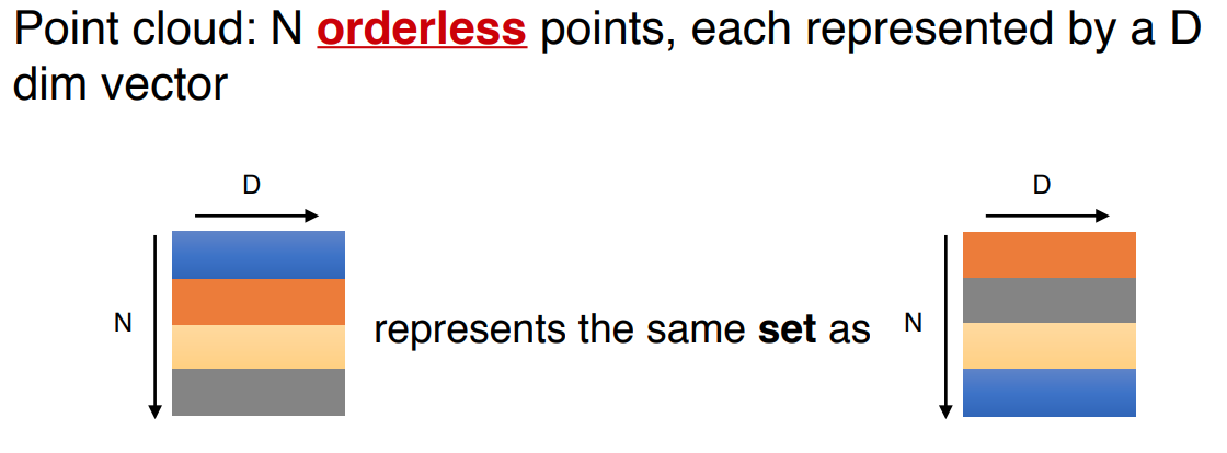 첫번째로 Point들은 정렬되어있지 않습니다. 이미지의 픽셀 배열이나 Volumetric grid의 Voxel 배열과 다르게 Point Cloud는 Point들의 집합으로 이루어져 있어 명확한 정렬이 없습니다. 다시말해 Point Cloud를 입력으로하는 Network는 $N$개의 Point들을 입력으로 사용할때 $N!$개의 순열(permutation)이 생기고 연산의 결과가 입력 순서에 불변해야 합니다.